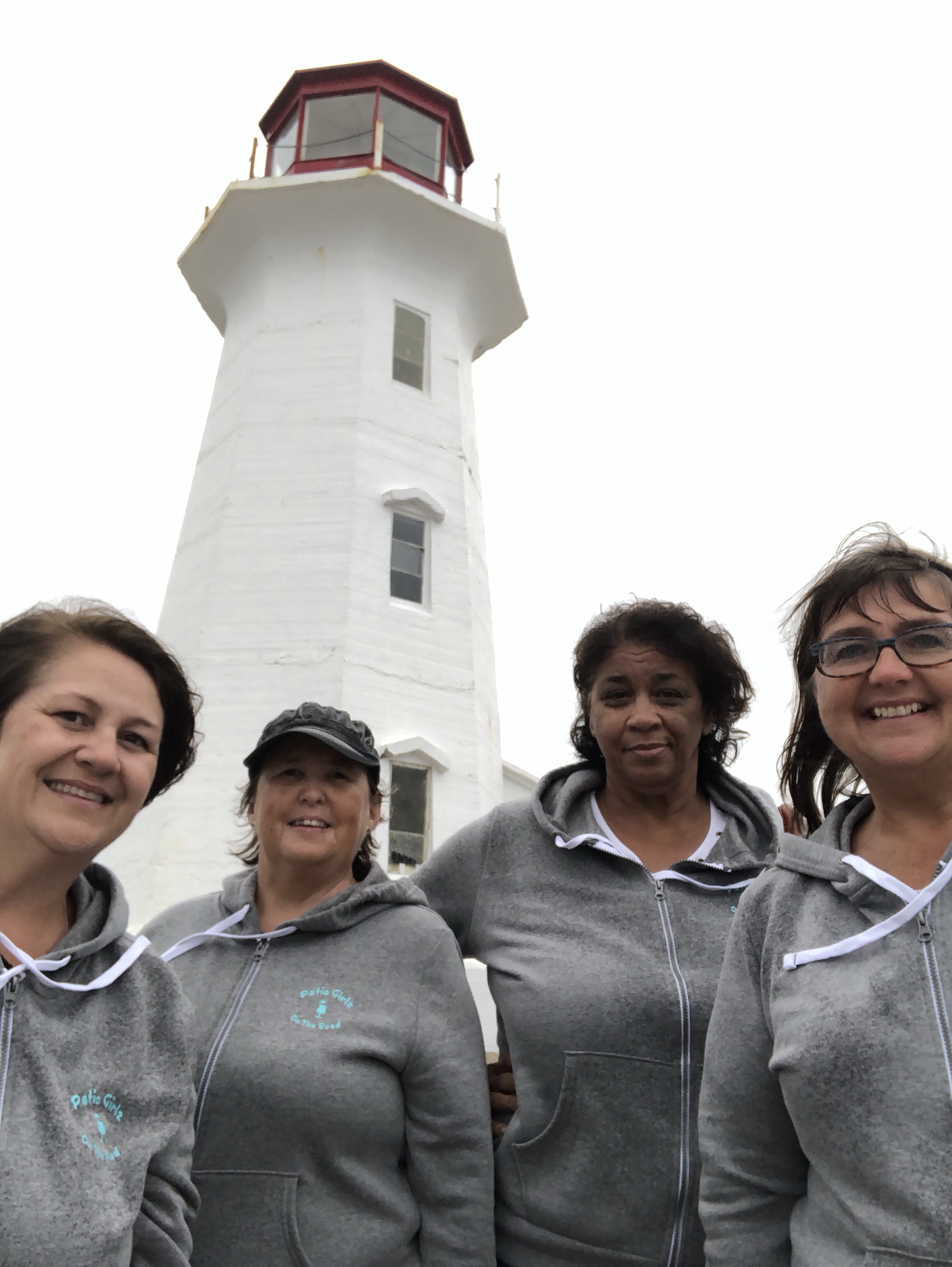 Our final stop was #Peggy’s Cove, one of the most popular tourist destinations in the province. The good news was that, as we drove in, five tour buses were leaving; the bad news was it started to drizzle! We Patio Girlz are a hearty bunch and headed for the lighthouse wearing our matching hoodies.