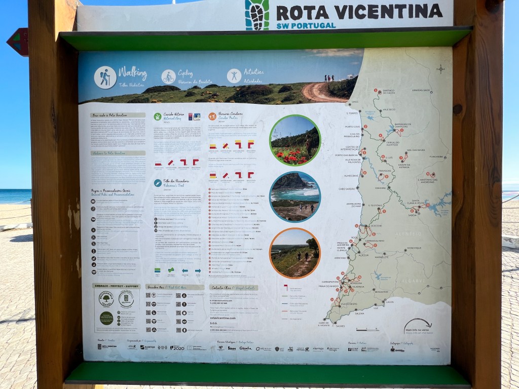 Rota Vicentina is a walking trail in Portugal that runs 350 km down the coast called the Fisherman’s Way, and a second route inland. Both are made up of sections and connect through villages. During our meandering into Salema, a small coastal town in the Algarve we came across a trailhead sign board.