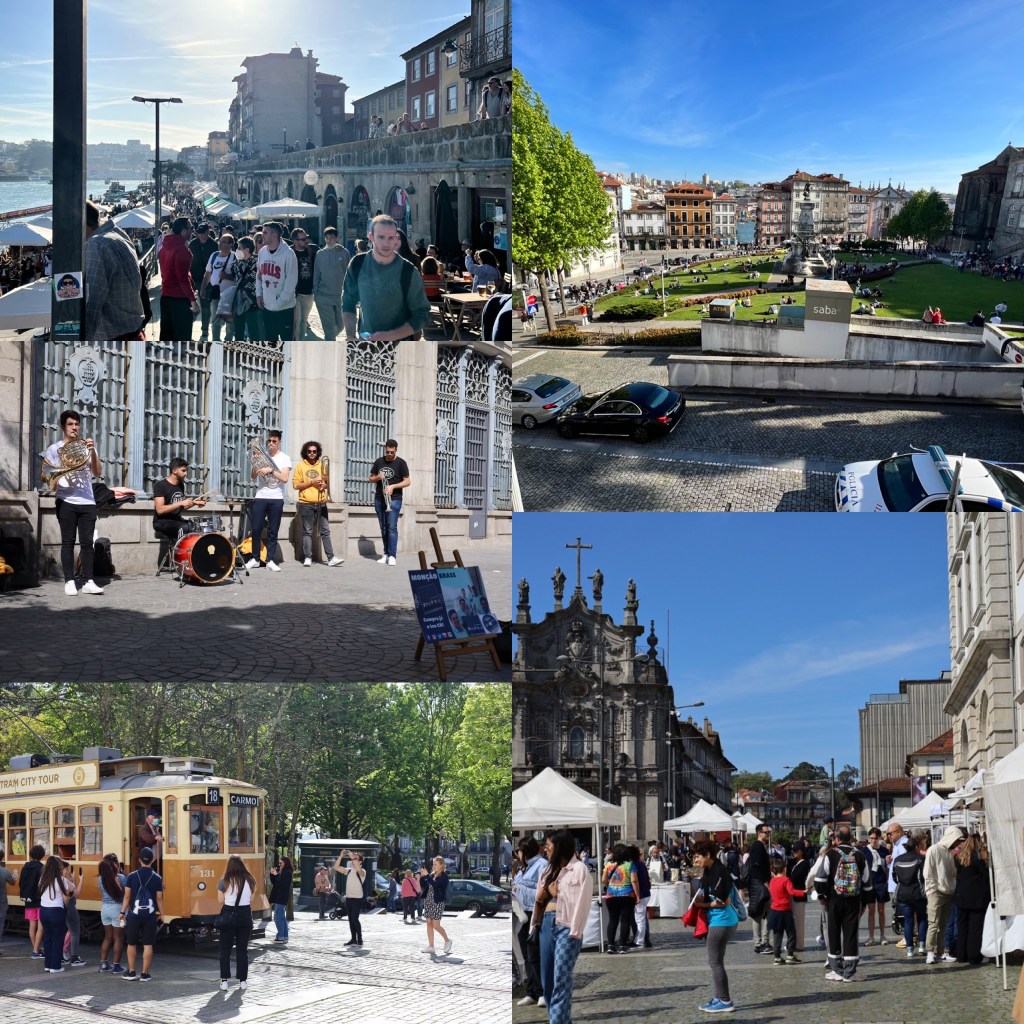 The atmosphere of Porto when we arrived on the holiday weekend was definitely that of a street party. The weather was ideal for it: sunny and warm. Tour guides carrying bright green umbrellas bustled their groups everywhere you looked, children played patty cake while parents lounged on the lawn in one of the squares, art and craft venders sold their creations under white tents in one of the parks. People gathered around small cafe tables enjoying drinks and ice cream. Cameras and cell phones were hard at work everywhere and street musicians entertained the crowds throughout.